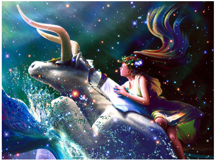 Solo, buscaba al toro; solo lo perseguía hasta la guarida; solo lo capturó y montó sobre su lomo. A su alrededor permanecían las Siete Hermanas estimulándole en su camino y, en la resplandeciente luz, él conducía al toro a través de la brillante agua hacia la isla de Creta sobre la tierra donde moraban los tres Cíclopes.